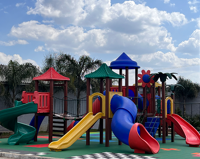 Brinquedos sensoriais, de uso individual e também coletivo, o parque externo também possui tobogãs, balanços, escorregas e outras brincadeiras lúdicas e educativas.